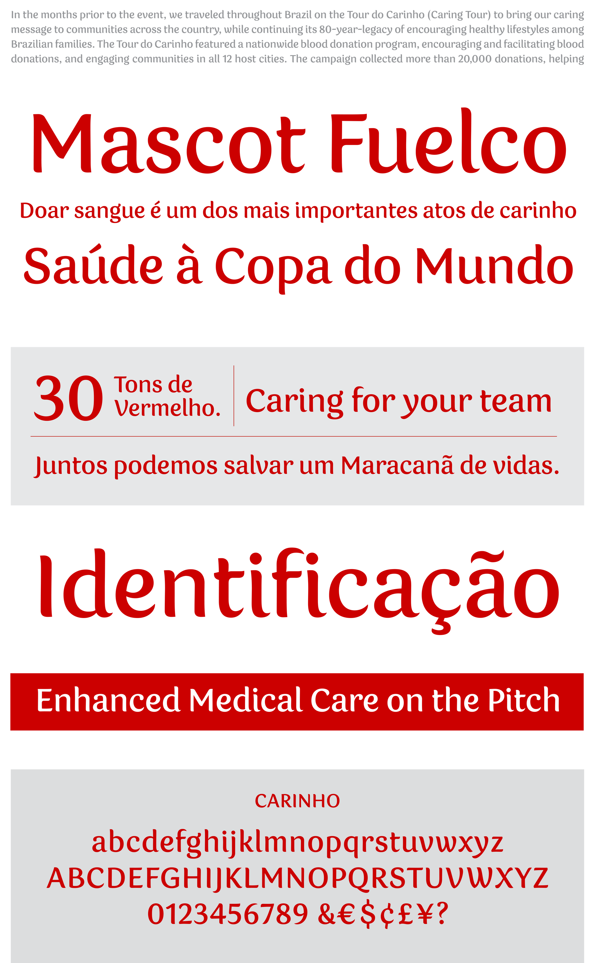 As the official healthcare sponsor for the 2014 FIFA World Cup in Rio de Janiero, Johnson & Johnson launched a campaign to feature stories around the power of caring and how it connects people globally. Lux Typo created the custom font, Carinho for the Global Strategic Design Office of Johnson & Johnson as a key component to the campaign's identity.