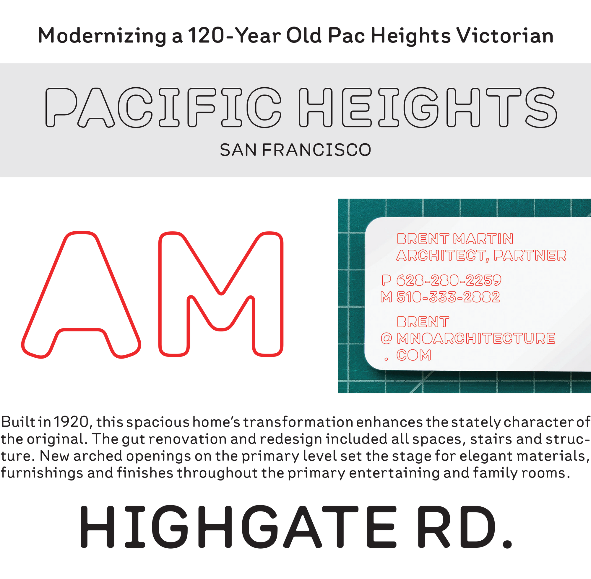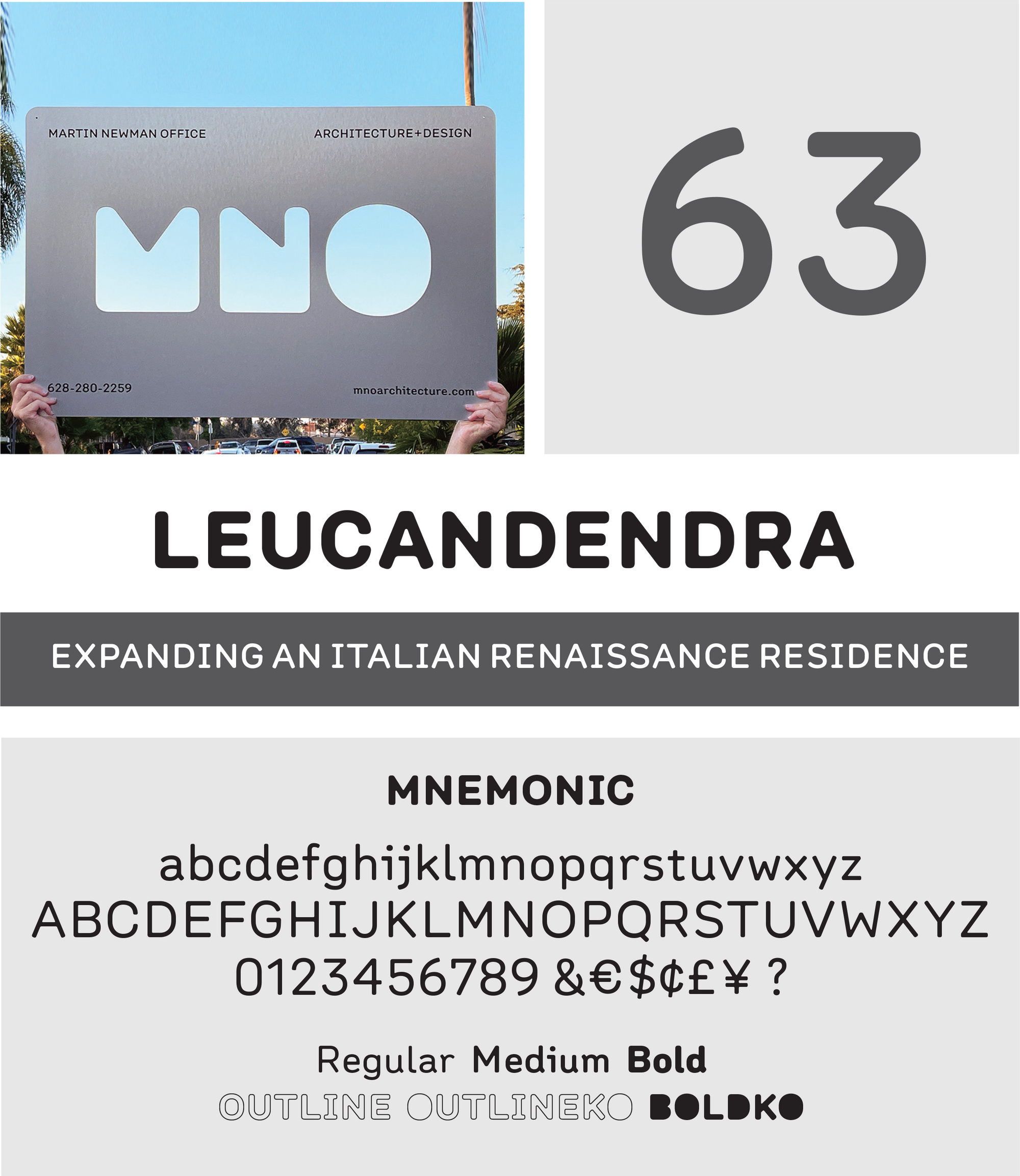 As part of their rebranding, Martin Newman Office approached LuxTypo to create the identity for the architecture firm. The immediate request from Brent Martin, founding partner, was the desire to have a proprietary typeface be the main element to the identity. Initially starting with the MNO logo, the idea of the 'architect's template' extended beyond the initial mark and into a typeface. Mnemonic has proven to be a dynamic asset with its versatility and distinction.