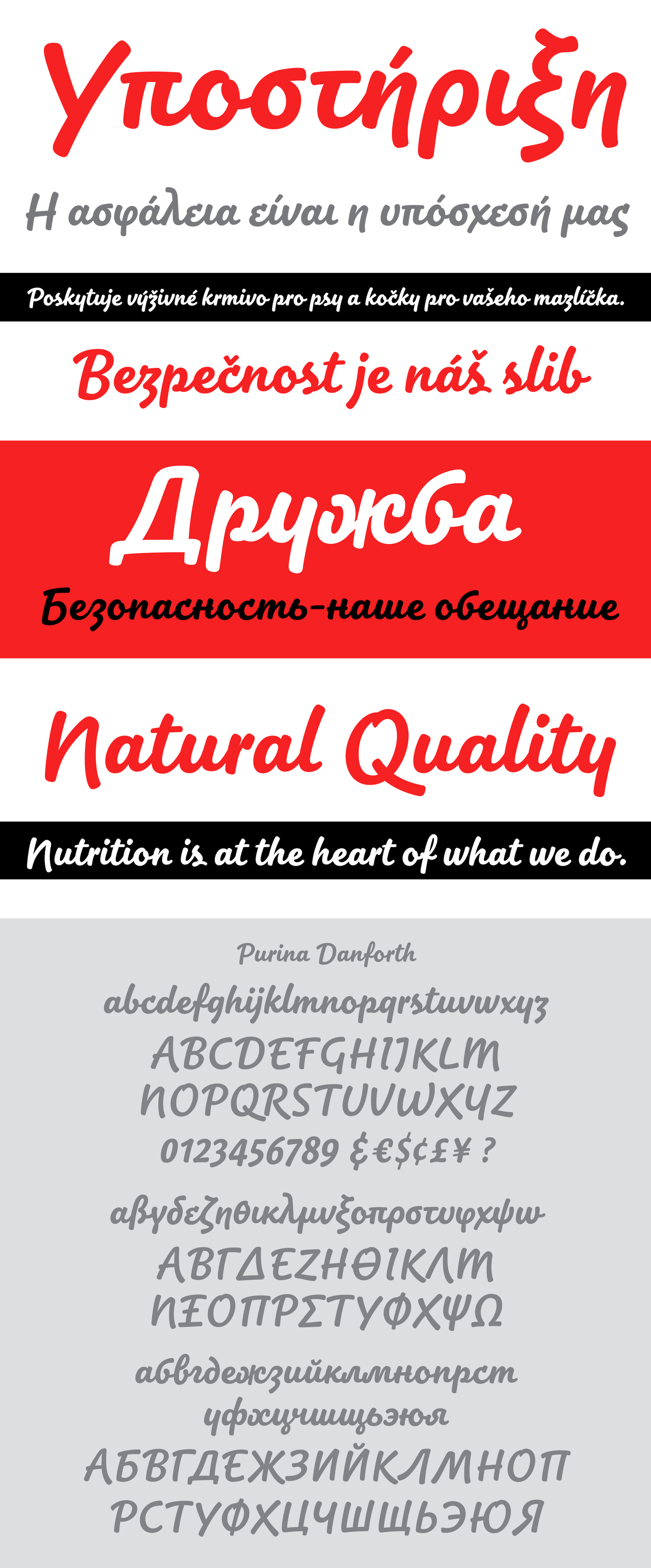 The Danforth script gives a humanistic accent to the visual communicative needs of the Purina brand. The font supports Latin, Cyrillic and Greek. Danforth's friendliness is heightened by it’s ‘hand-like’ nature through the support of alternative characters available in the open type features of the font.