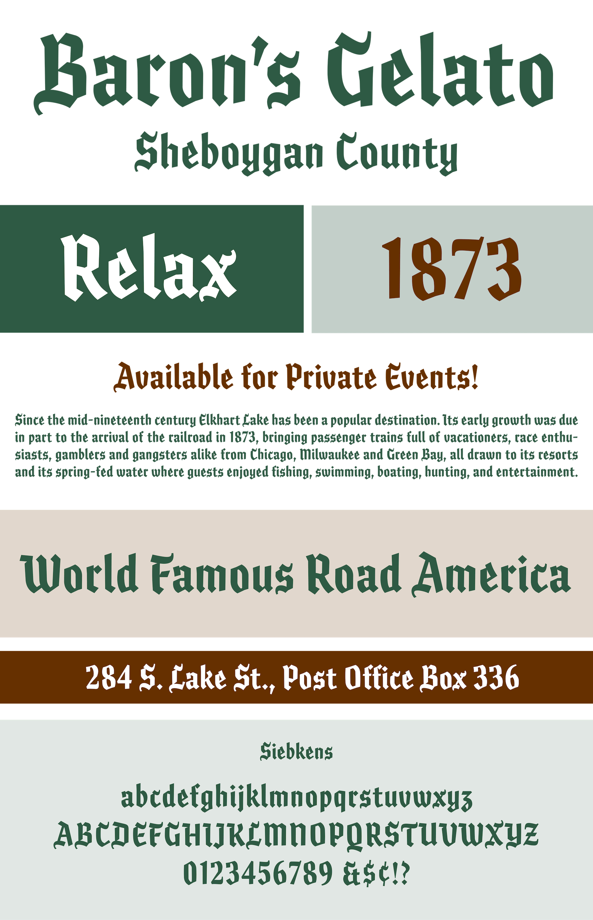 In rebranding Siebkens, Applied Arts tapped into the Wisconsin-based resort’s legacy by revisiting an array of early logotype that creative director, Tyson Thorne, had discovered. Deciding to go with the black letter inspiration, LuxTypo developed a new logotype for the resort. As appeal for the logotype grew and application needs arose, it was decided to extend this limited character set into a full font to sup- port the marketing and identity needs of the brand.